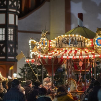 Schwebe in 6 m Höhe über dem Weihnachtsmarkt-Geschehen, mit Blick auf die Kinder-Bühne und liebevoll dekorierten Hütten. Betreiber: KTL Event Schmiede GmbH & Co. KG